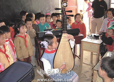 圖為紫金路小學(xué)學(xué)生到萬(wàn)福村小學(xué)為學(xué)生作琵琶示范演奏。