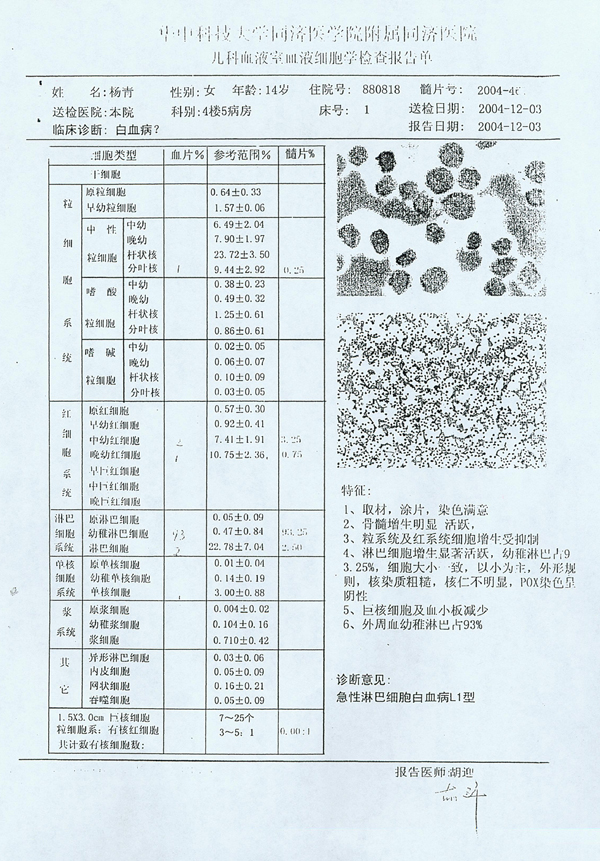 楊青血液細胞學檢查報告單(圖)