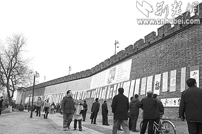 荊楚網(wǎng)(楚天都市報(bào))(記者釋喻 攝)前日上午,襄樊西門(mén)橋古城墻上舉辦了一場(chǎng)別開(kāi)生面的書(shū)法展,近百幅作品被懸掛在城墻上,向市民免費(fèi)展出,展覽為期7天。此次活動(dòng)由襄樊市文聯(lián)等單位舉辦,展出的是書(shū)法家王樹(shù)人先生的遺作和其傳人的近期作品;顒(dòng)現(xiàn)場(chǎng)還進(jìn)行了書(shū)法義賣,所得款項(xiàng)將用于襄樊歷史文化名城的保護(hù)和宣傳工作。