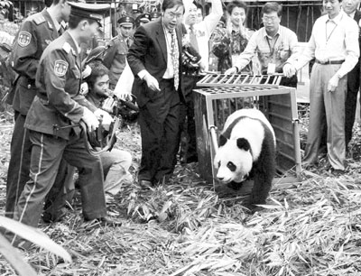 荊楚網(wǎng)消息(楚天都市報(bào))一只野生大熊貓日前闖入四川省都江堰鬧市(本報(bào)曾予報(bào)道),被當(dāng)?shù)亓謽I(yè)部門營(yíng)救,并被送往臥龍自然保護(hù)區(qū)療養(yǎng)。8月8日,戴有GPS衛(wèi)星定位儀器的大熊貓被放歸都江堰龍溪虹口國(guó)家自然保護(hù)區(qū)。當(dāng)天,它沒(méi)說(shuō)拜拜就踏出鐵籠走入密林,前后不到10秒鐘?蒲腥藛T在今后一年多的時(shí)間內(nèi),將對(duì)它進(jìn)行定位跟蹤,這有助于科學(xué)家進(jìn)一步了解和掌握大熊貓野外生活習(xí)性和活動(dòng)規(guī)律。(新華社發(fā))