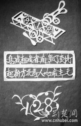 中國剪紙起源于裝飾藝術(shù)。樣式有窗花、燈花、喜花以及鞋墊花等。其中用來制作繡花底樣的雕花剪紙又名“花樣”,主要是供婦女刺繡使用的圖案底稿,大多是與民眾日常生活關(guān)系密切的傳統(tǒng)圖案。此次發(fā)現(xiàn)反映抗戰(zhàn)主題的50多張花樣剪紙,從構(gòu)圖、技法上看,比較稚嫩、粗糙,但充分體現(xiàn)了藝人們的創(chuàng)新精神。其中最顯眼的是一張邊緣殘缺、破舊的黃裱紙,上面依稀可見“兒童團(tuán)”三個(gè)字,是唯一的一張剪紙?jiān)。葉家慶介紹,寫著“打到了鄂南省減租減息,毛主席心(新)人馬北方新起”(如左圖)的花樣,從內(nèi)容分析,反映了1944年新四軍各軍區(qū)對日偽軍發(fā)動(dòng)春夏秋季攻勢,并粉碎日偽軍反撲,解放國土、人口,改善華中各抗日根據(jù)地的斗爭形勢。