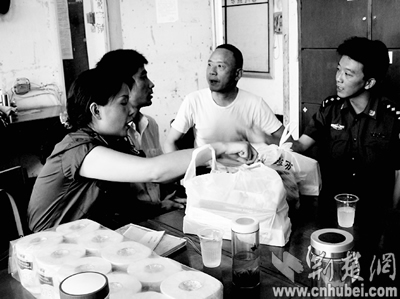 64歲的程婆婆拉著曉軍(化名)的手說:“兒啊,快看誰來了?”曉軍抬起頭,發(fā)現(xiàn)接見室里除了母親外,還有武昌紫陽街起義門社區(qū)黨委書記袁先高、管段民警方文等一行8人,手里提著紙巾、拖鞋、毛巾等日常用品,還有他最愛吃的鴨脖子和鹵蹄。