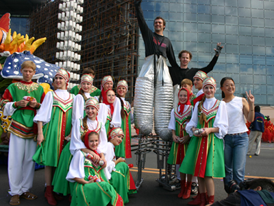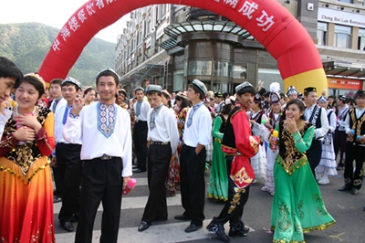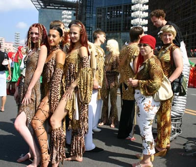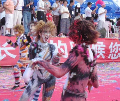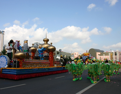 今天上午在新海廣場舉行的第六屆大連狂歡節(jié),更是使歡樂的海洋里掀起了歡樂的海潮。來自國內(nèi)外的24支狂歡巡游隊伍,以花團錦簇的民族服裝和極度夸張的藝術(shù)手法,演繹了航天、花神、特洛伊木馬、梁山伯與祝英臺、孔雀仙子、海底動物、蝴蝶服飾、阿凡提、醉酒、美人魚、回娘家、貓友、豪華游覽馬車、日月潭傳說、堂吉訶德、木偶奇遇、狐假虎威、寶蓮燈、海娃與王子、小櫻丸子、尼爾斯騎鵝記、阿里巴巴、輪滑表演等國內(nèi)外著名童話,電影故事等。最為耀眼的是以音樂劇《貓》的扮相出場的表演隊伍,他們獨特的表演和造型贏得了在場觀眾最多的歡呼聲?駳g的服裝藝術(shù)巡游,吸引了數(shù)萬國內(nèi)外游客和當?shù)孛癖姷挠^賞。