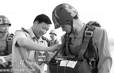在“神舟”六號發(fā)射前夕,記者來到駐鄂空降兵某部軍營,采訪了曾任聶海勝傘訓教官的空降兵某部研究所所長李振波。