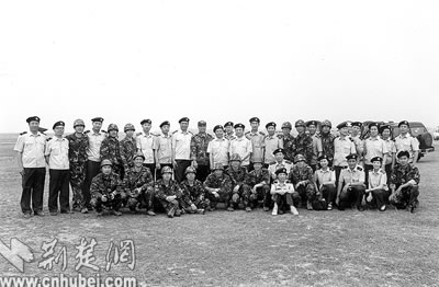 我國首批宇航員在駐鄂空降兵某部圓滿完成傘訓任務后,與部分傘訓保障人員合影。前排左二為聶海勝,后排右六為費俊龍,后排左六為楊利偉。