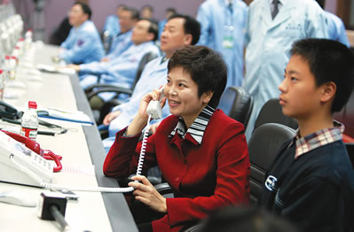 12日21時(shí)34分,正在神舟六號(hào)飛船返回艙內(nèi)的航天員費(fèi)俊龍和聶海勝與北京航天飛控中心指控大廳內(nèi)的家人進(jìn)行天地通話。