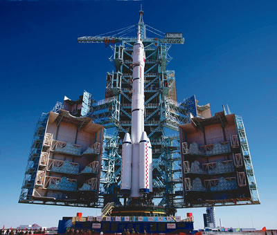 長(zhǎng)征二號(hào)F型火箭等待著它的第6次飛行。兩小時(shí)45分鐘前,執(zhí)行神舟六號(hào)載人航天飛行任務(wù)的航天員費(fèi)俊龍和聶海勝進(jìn)入飛船返回艙,“神箭”和“神舟”第一次迎來了兩名乘客。