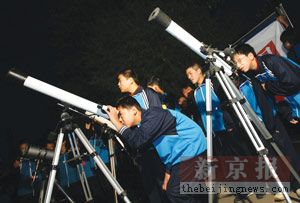 根據(jù)北京天文館專家預測的時間,神六飛船昨天共有兩次光臨北京。無奈天公不作美,密布的烏云集聚北京上空,清晨4時34分左右,神六悄然溜過一次;5時30分,黃松峪中學的一些天文愛好者在學校實驗大樓前架起5架天文望遠鏡,欲一睹神六風采。他們踮起腳,伸長脖子,努力把眼睛貼上望遠鏡,但仍沒有親眼看到神六飛臨北京。該校一名初中二年級的學生展平說,他以前曾觀看過流星等天文現(xiàn)象,對神六飛船非常向往,希望能親眼看到神六。