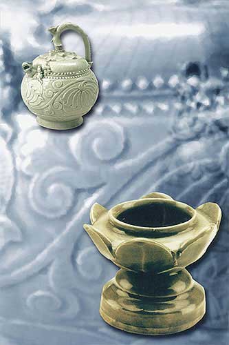 青釉提梁倒流瓷壺:酒器(上,高18.3厘米)