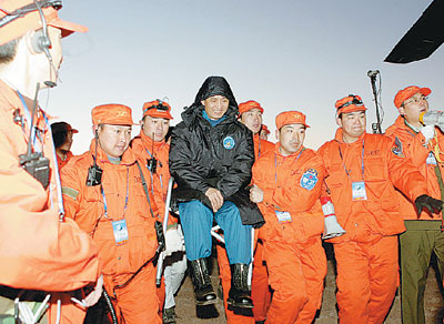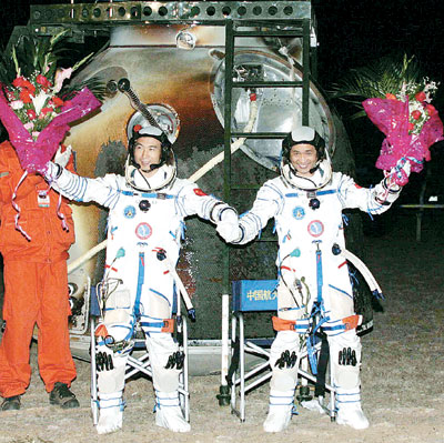 轉(zhuǎn)眼之間,艙門已被打開。費(fèi)俊龍、聶海勝向人們揮動著手臂,輕快出艙。細(xì)心的工作人員,已經(jīng)在艙門外為他們擺好了兩把椅子。