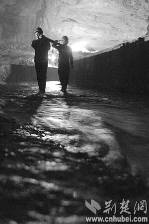 寂寞的蝙蝠第一次接待了人間來客,沉睡萬年的巖溶洞穴第一次迎來了觀者。但黑暗陌生的世界還是讓堂堂男兒們感覺了一絲陰森恐怖。他們曾聽當?shù)匕傩諅髡f,洞里有巨蟒,所以至今沒人敢進洞!白ゾo時間測量!”來不及恐懼,他們?yōu)樽约汗膭,因為這里隨時可能發(fā)生漲水、墜落等危險?上,第一次經(jīng)驗不足,手電筒的電池很快用完了,一行人只得互相攙扶著,摸索出溶洞!昂髞,我們又進去了7次,終于測出了暗河的具體位置和流向!狈轿奈湔f。