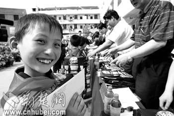 我省2005年春季“希望工程助學(xué)進(jìn)城計(jì)劃———金龍魚農(nóng)民工子女助學(xué)金”本月起開始陸續(xù)發(fā)放,1000余名在漢打工的農(nóng)民工子女可獲得每學(xué)期300元的資助款。預(yù)計(jì)五年內(nèi),我省將有4000人次的農(nóng)民工子女獲此項(xiàng)資助。圖為武漢市東升學(xué)校二年級(jí)的李灣小朋友領(lǐng)到助學(xué)金后高興地笑了。
