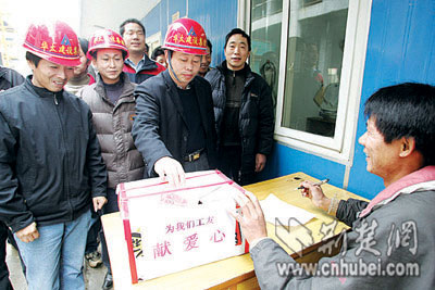 工友們悄悄謀劃開了。昨日上午,在施工現(xiàn)場,大家你100、我50地將錢投進(jìn)捐款箱。一個多小時內(nèi),共捐款3460元。