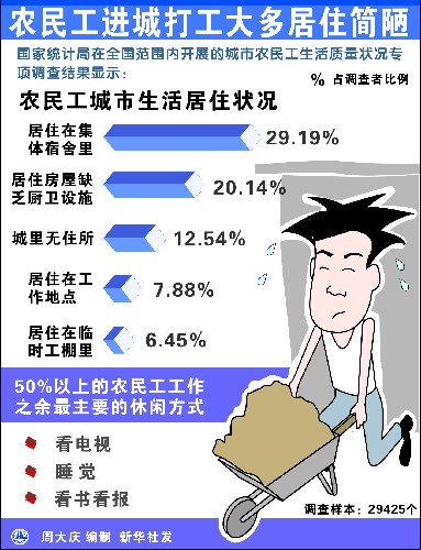 農(nóng)民工在城市打工,大多居住在簡陋的宿舍里。據(jù)調(diào)查,有29.19%的農(nóng)民工居住在集體宿舍里,有20.14%的農(nóng)民工居住在缺乏廚衛(wèi)設(shè)施的房間里,有7.88%的農(nóng)民工居住在工作地點,有6.45%的農(nóng)民居住在臨時搭建的工棚里,還有12.54%的農(nóng)民工在城里沒有住所,只能往返于城郊之間,或回農(nóng)村居住。