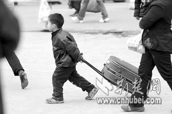 昨日,武昌火車站進(jìn)站口,快樂(lè)的小方樾幫大人拖著行李箱(上圖)。