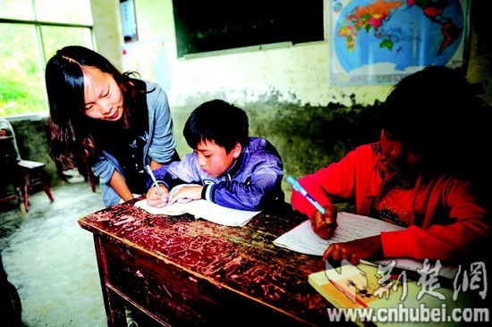 圖為:張春麗再次走進(jìn)課堂,輔導(dǎo)孩子們語(yǔ)文。