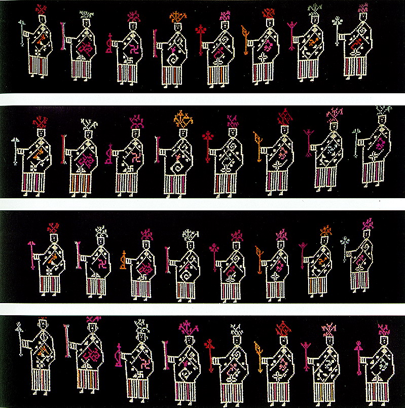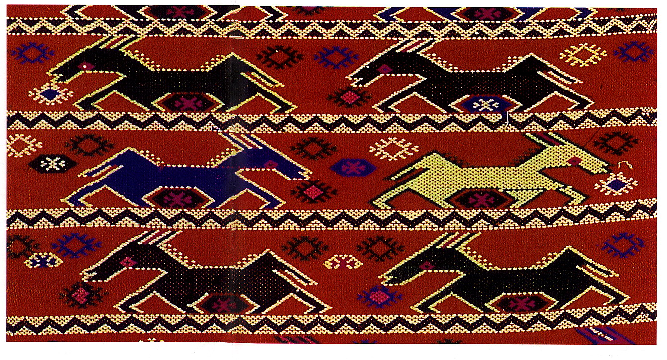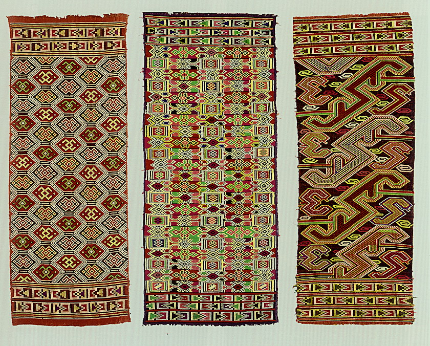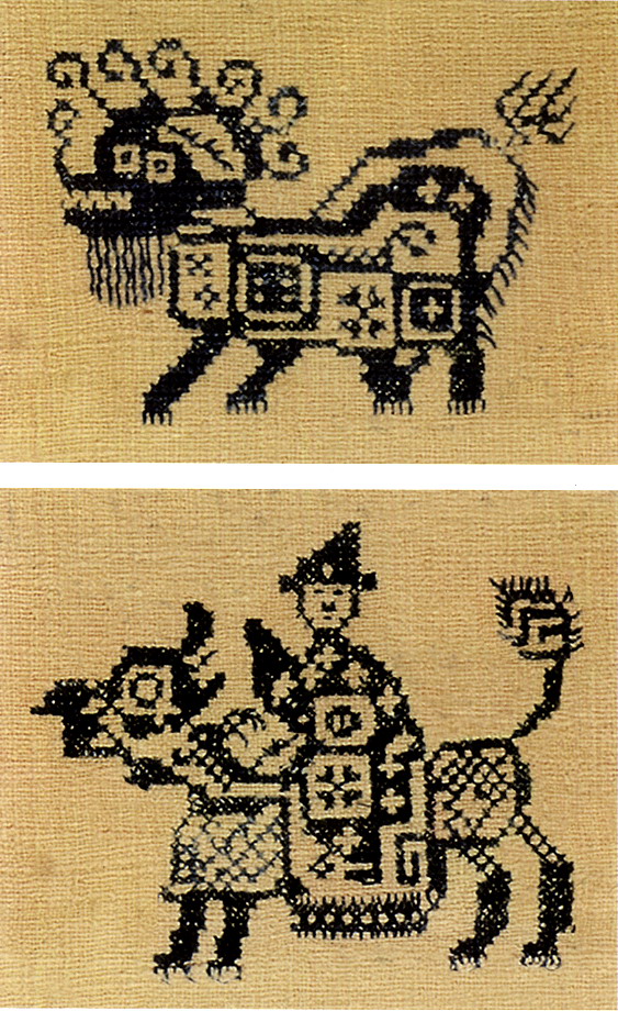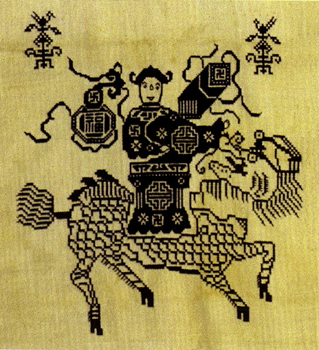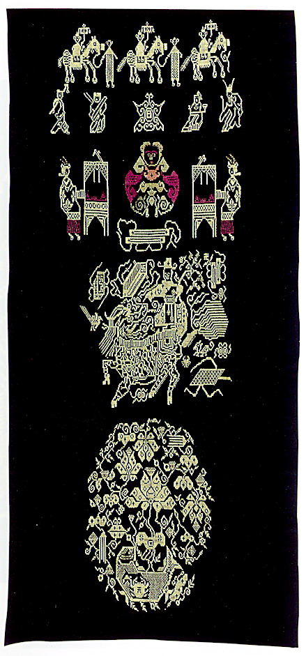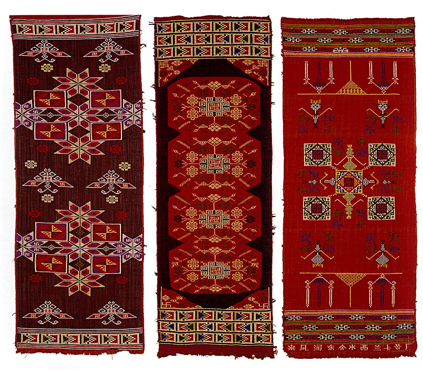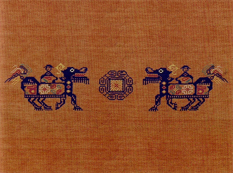 土錦以“通以斷緯”為編織手段,受巴楚文化的影響:1、紋飾既抽象又有形,土錦圖案來(lái)自對(duì)大自然的感受,身邊的物象也是編織者寄情抒懷的選擇,不論是對(duì)動(dòng)物或用具,還是對(duì)天象星座,都能運(yùn)用夸張變形的手法,達(dá)到抽象裝飾美的效果。2、色彩上注重原色與復(fù)色的互補(bǔ):運(yùn)用紅、黃、藍(lán)三色,并延伸以赤、黃、青、白、黑為五正色。