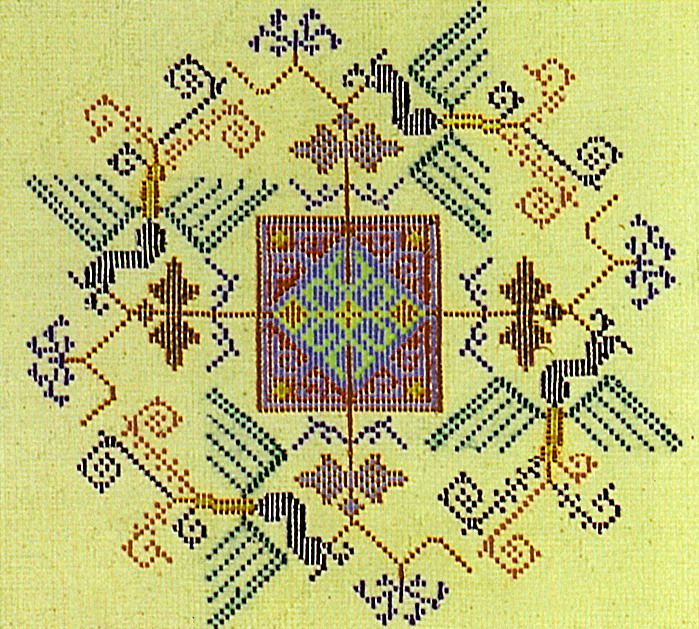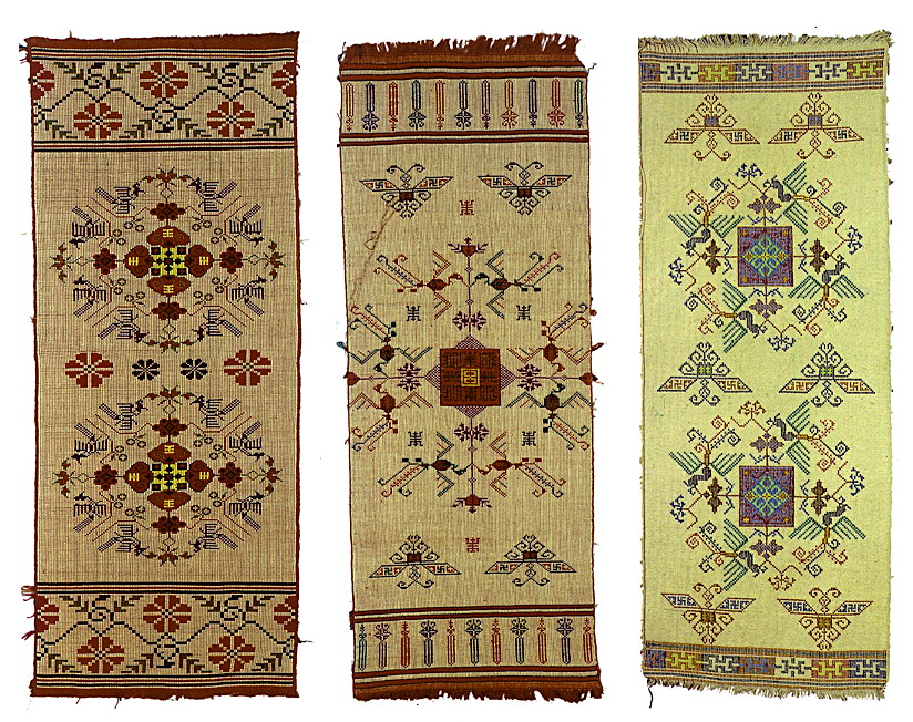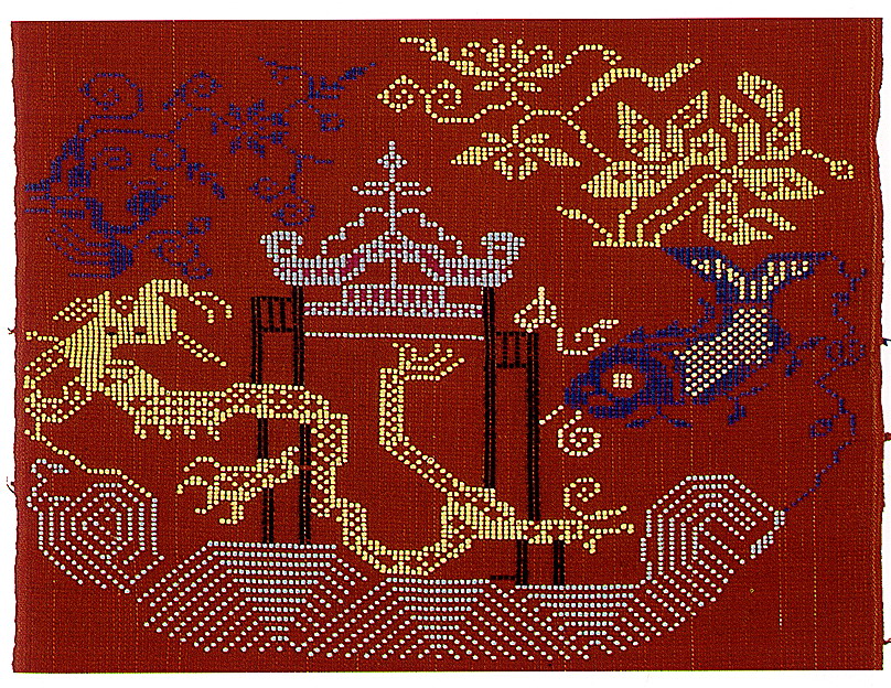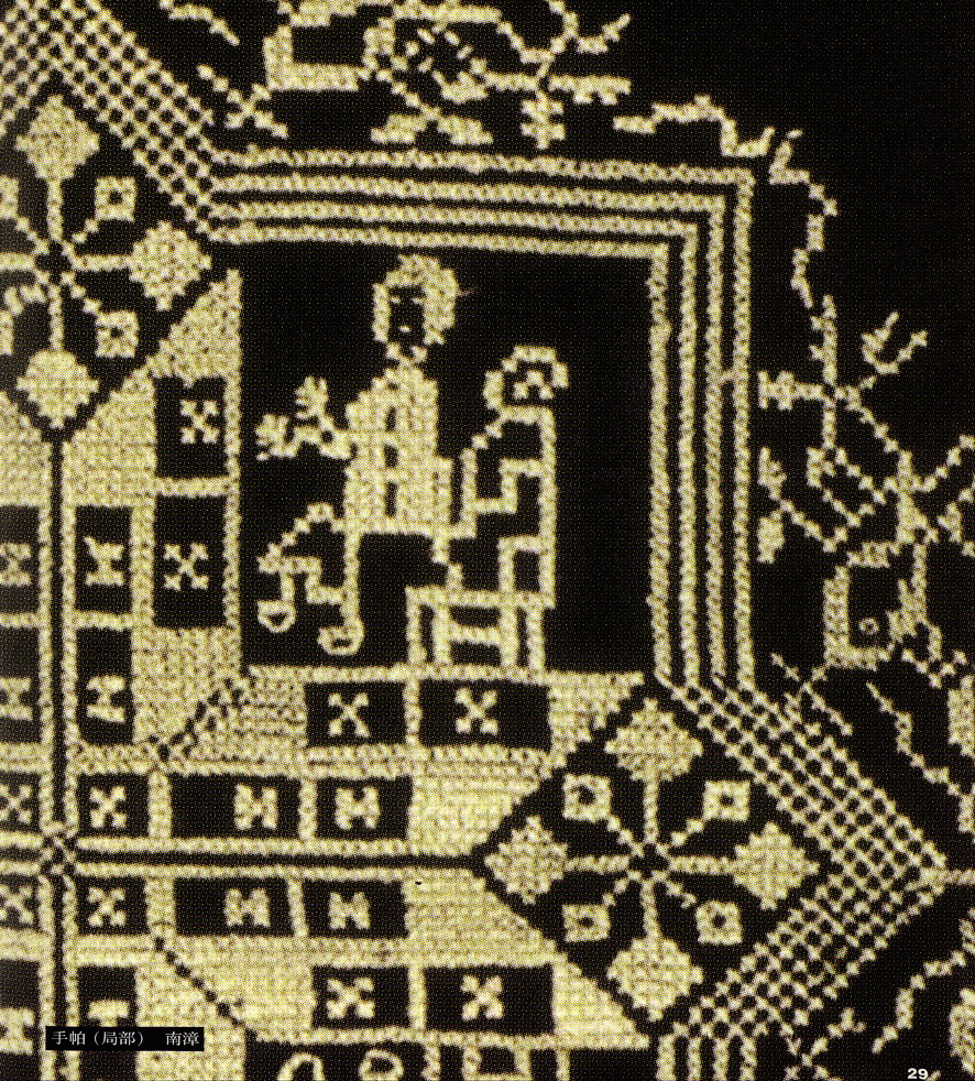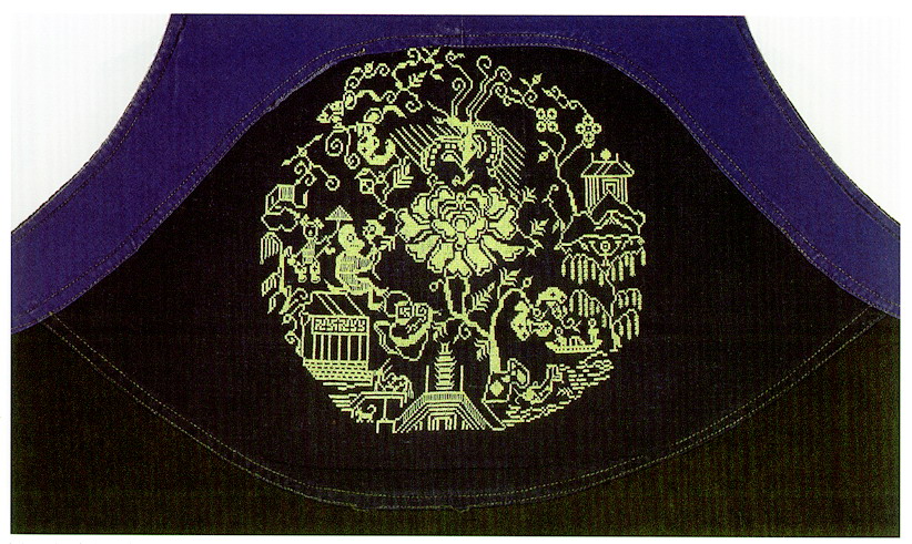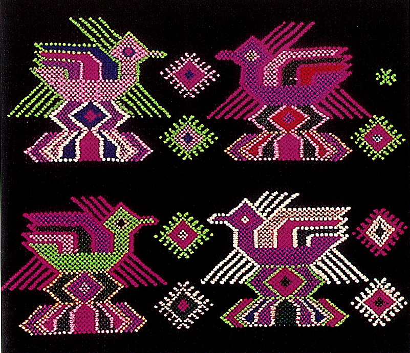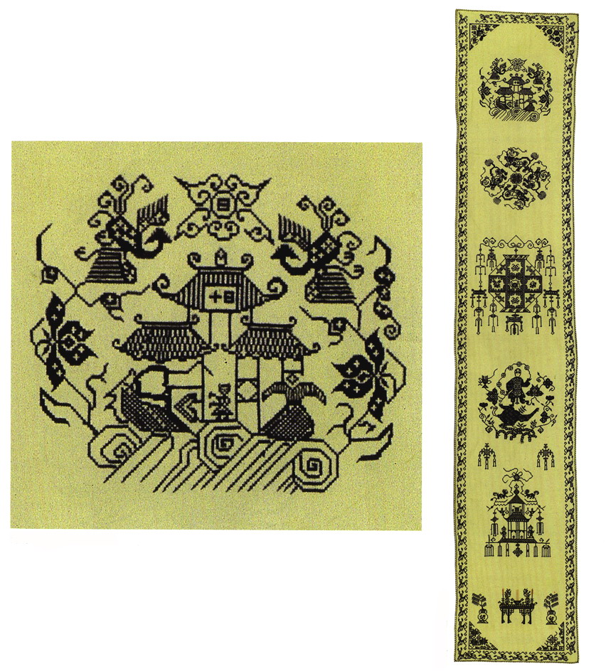 挑花針法有平挑花和十字花兩種,即在平布上面依紗眼用繡花針扣上十字形,然后以此為骨架,填置上多種需要花紋,采取反面挑花正面看手法,其優(yōu)點(diǎn)有二:一是保持清潔;二是便于打結(jié)。構(gòu)圖多是幾何圖形,也有動(dòng)植物的幾何圖案。其結(jié)構(gòu)主要有對(duì)稱式、交叉式、二方連續(xù)式、斜菱形、單獨(dú)紋樣等等。圖案花紋既規(guī)整而又變化多姿,給人以舒暢愉快的感覺。