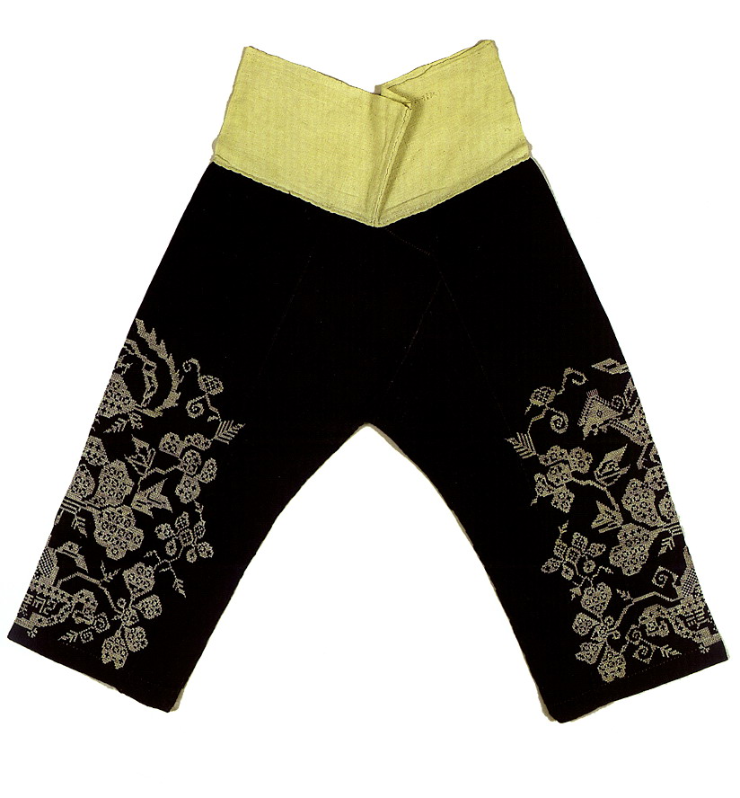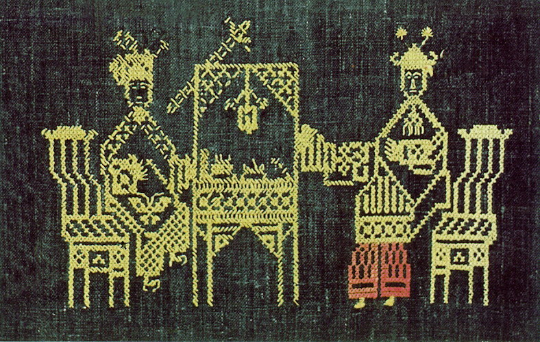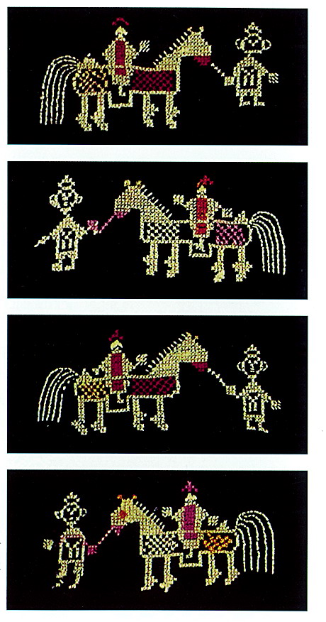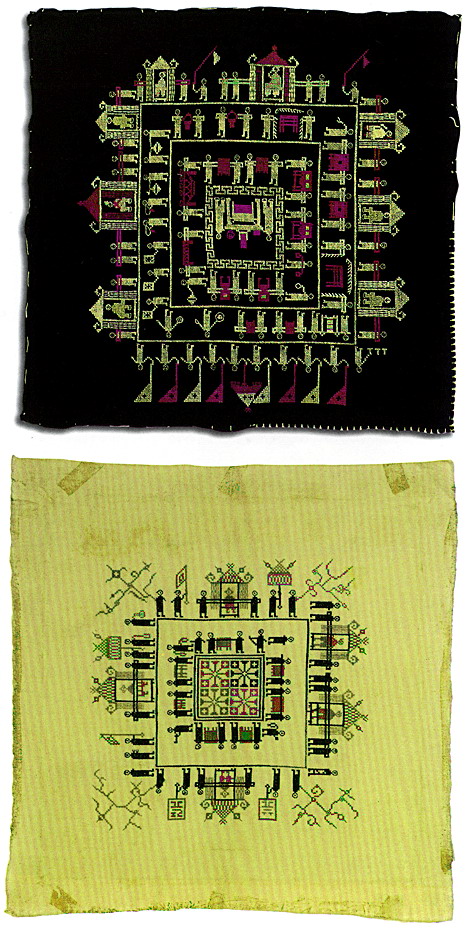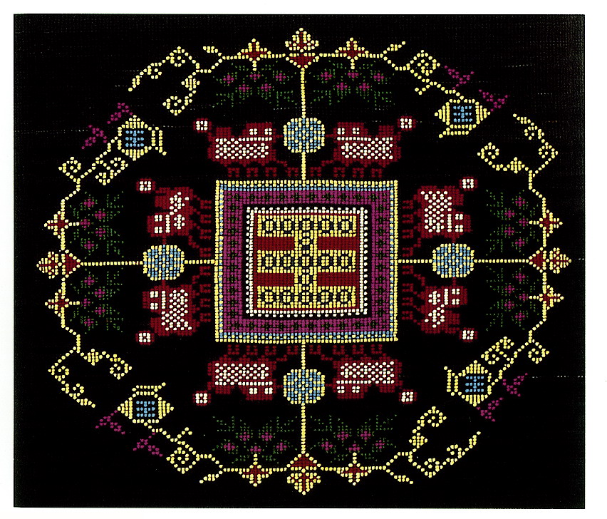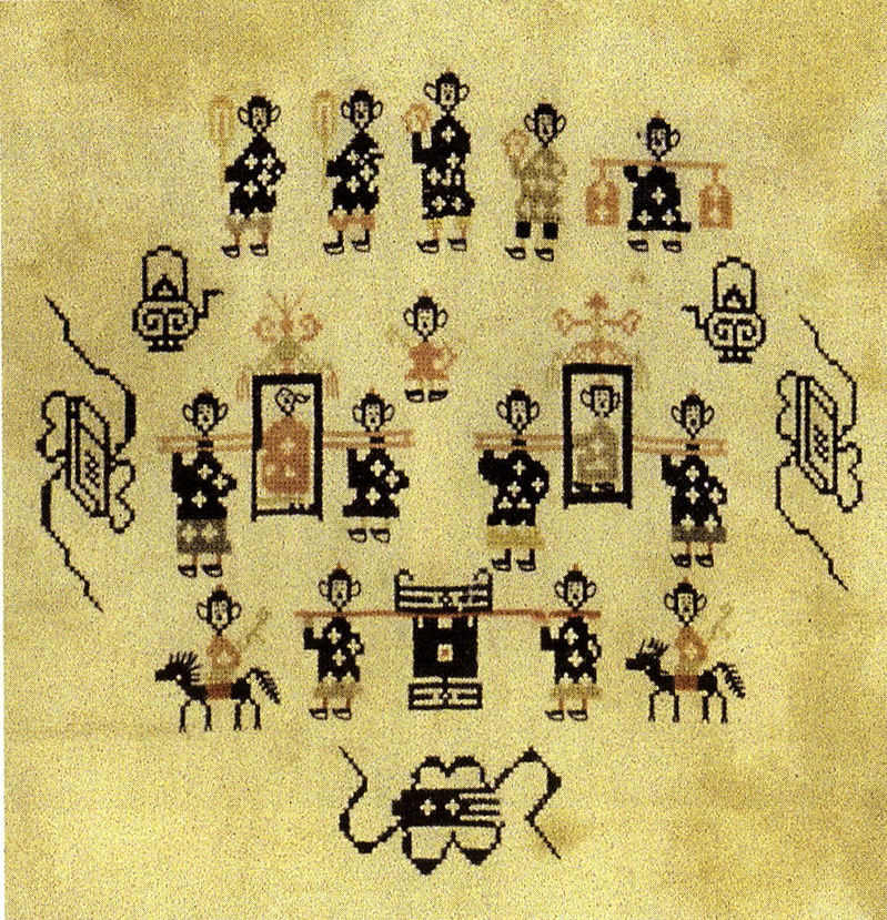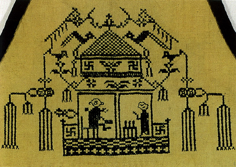 挑花針法有平挑花和十字花兩種,即在平布上面依紗眼用繡花針扣上十字形,然后以此為骨架,填置上多種需要花紋,采取反面挑花正面看手法,其優(yōu)點(diǎn)有二:一是保持清潔;二是便于打結(jié)。構(gòu)圖多是幾何圖形,也有動(dòng)植物的幾何圖案。其結(jié)構(gòu)主要有對(duì)稱式、交叉式、二方連續(xù)式、斜菱形、單獨(dú)紋樣等等。圖案花紋既規(guī)整而又變化多姿,給人以舒暢愉快的感覺。